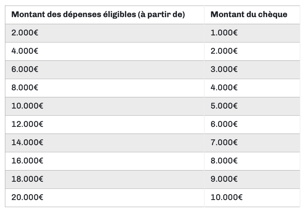 - Pour recevoir votre subvention, vous devrez transmettre la demande de versement avec les factures acquittées (dans un délai maximal d'un an). Le versement prend la forme d'un paiement unique ou d'un paiement en 2 fois.