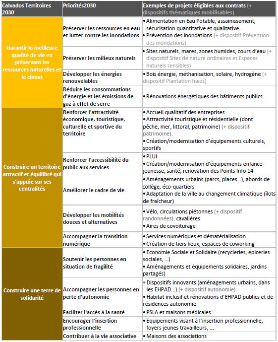 Renforcer les centralités du Calvados, préserver l'environnement et lutter contre le dérèglement climatique, favoriser la solidarité entre les hommes et entre les territoires sont les grandes ambitions de cette nouvelle politique territoriale. L'objectif est de faire du Calvados un département où il fait bon vivre, où chaque habitant a accès en un temps réduit à des services de qualité, afin de s'épanouir pleinement à tout âge de la vie (équipements sportifs, de lecture publique, d'accueil de spectacles, de petite enfance, bâtiments publics isolés énergétiquement, accessibles aux personnes à mobilité réduite, aménagements et équipements adaptés aux seniors, itinéraires cyclables de qualité, eau et espaces naturels préservés et accessibles au public...).