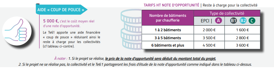 Pour savoir s’il est possible ou non de créer une chaufferie bois-énergie, le Te61 réalise une note d’opportunité. Celle-ci ne se substitue pas à une étude de faisabilité ultérieure, mais permet d’en établir le cahier des charges.