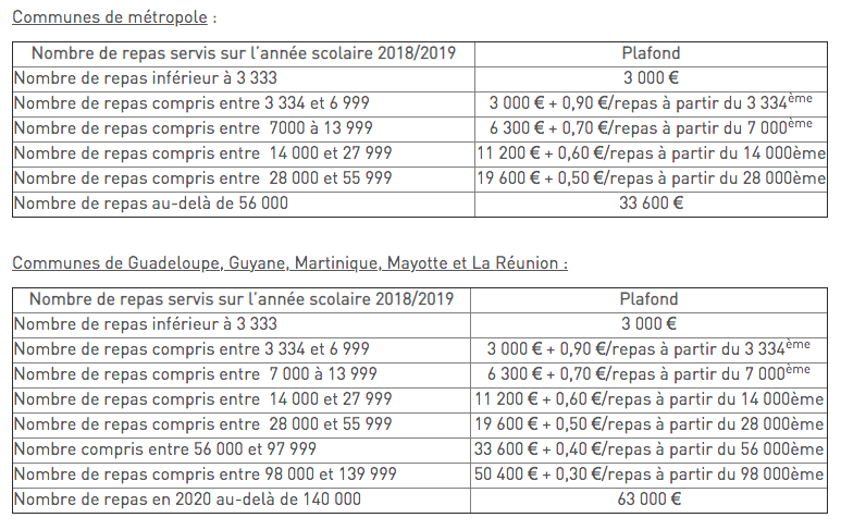 Le taux de subvention est fixé à 100% du montant HT des dépenses éligibles dans la limite d'un plafond déterminé en fonction du nombre de repas servis aux élèves d'écoles primaires pendant l'année scolaire 2018-2019, de la manière suivante :