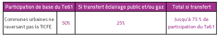Le Te61 participe à hauteur de 50 % sur les effacements pour les communes urbaines qui ne reversent pas la TICFE. Le montant de cette participation peut être bonifié si la collectivité répond au critères par le syndicat.