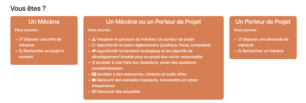 A cette fin, l'Espace internet permet aux porteurs de projet (collectivités, associations...) et mécènes (entreprises, fondations, fonds de dotation...) :