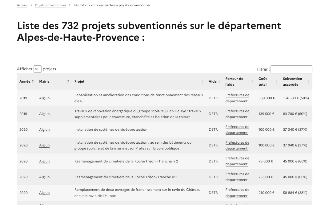Aides-territoires présente les projets déjà soutenus par certaines subventions. Vous pouvez vous aussi rendre publiques les bases de données de vos projets lauréats en nous les partageant à l'adresse aides-territoires@incubateur.anct.gouv.fr !